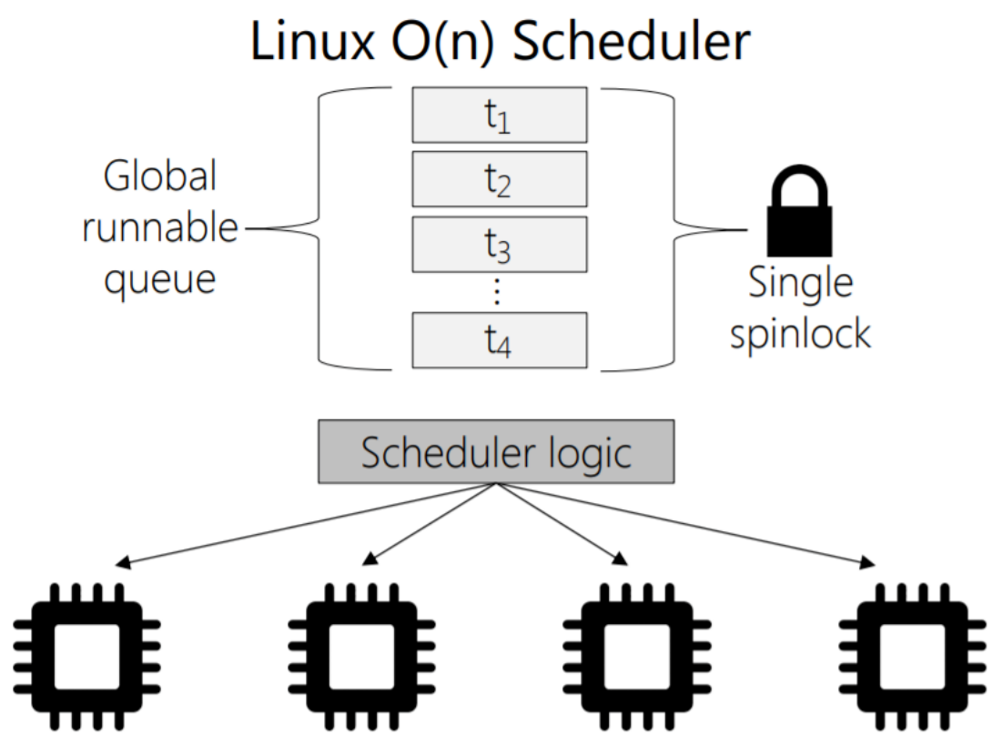 --- #### Linux 2.4 kernel: SMP implemented in kernel mode - The use of multiple processors can speed up the processing speed of the kernel, and the scheduler has a complexity of O(n) - The kernel scheduler maintains two queues: runqueue and expired queue - Both queues are always in order - When a process runs out of time slice, it will be inserted into the expired queue - When the runqueue is empty, swap the runqueue with the expired queue  --- #### Linux 2.4 kernel: SMP implemented in kernel mode - The use of multiple processors can speed up the processing speed of the kernel, and the scheduler has a complexity of O(n) - Globally shared ready queue - Find the next executable process, this operation is usually O(1) - Every time a process runs out of time slices, find a suitable location to perform an insertion operation, and it will traverse all tasks with a complexity of O(n)  --- #### Linux 2.4 kernel: SMP implemented in kernel mode - The use of multiple processors can speed up the processing speed of the kernel, and the scheduler has a complexity of O(n) - Modern operating systems are capable of running thousands of processes - The O(n) algorithm means that every time you schedule, for the currently executed process, you need to go through all the processes in the expired queue and find a suitable place to insert - This will not only bring a huge loss in performance, but also make the scheduling time of the system very uncertain -- depending on the load of the system, there may be several times or even hundreds of times of difference